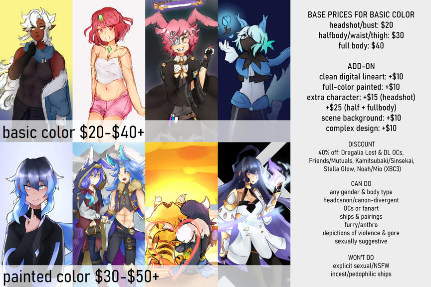 I offer art commissions for personal use, and for smaller/indie creators in content use!